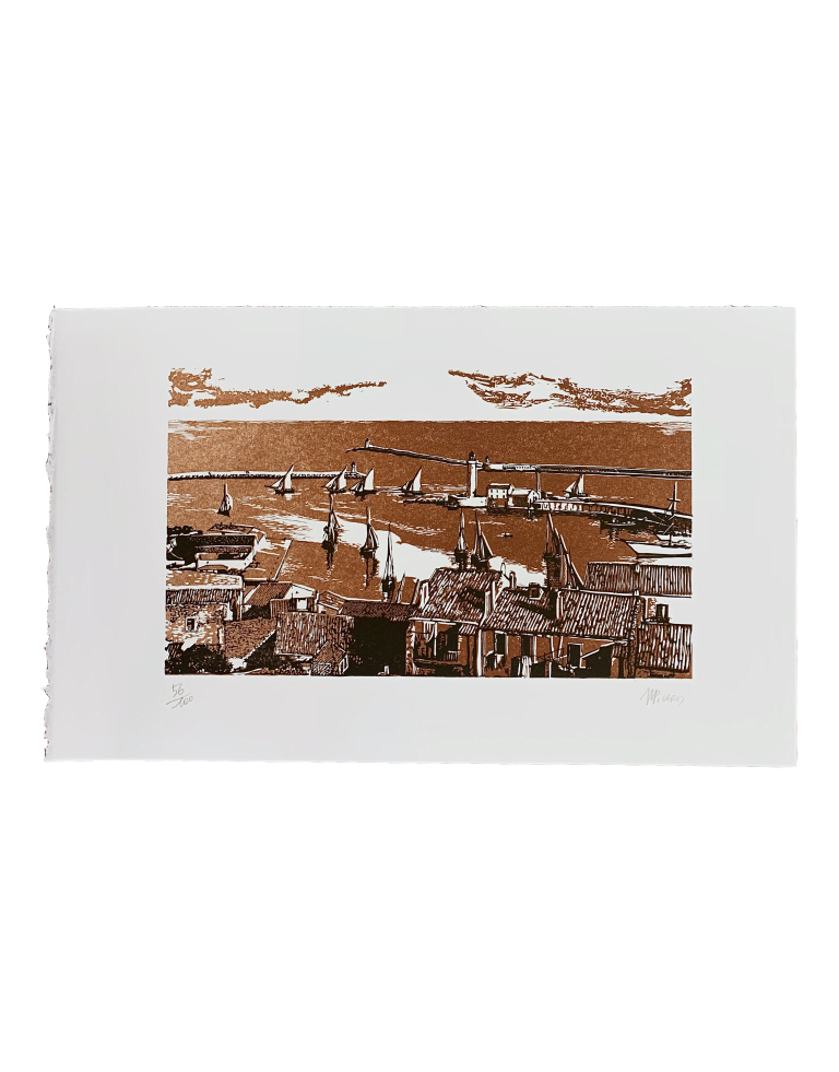 Gravure réalisée par notre Graveur Jean-Marie Picard, représentant la Marine de Sète. avec vue sur le Môle et le Brise Lame, cette estampe dessine un grand classique du paysage Sètois. Oeuvre numérotée en bas à gauche, signature de l’artiste en bas à droite. | 100,00 € | ||||